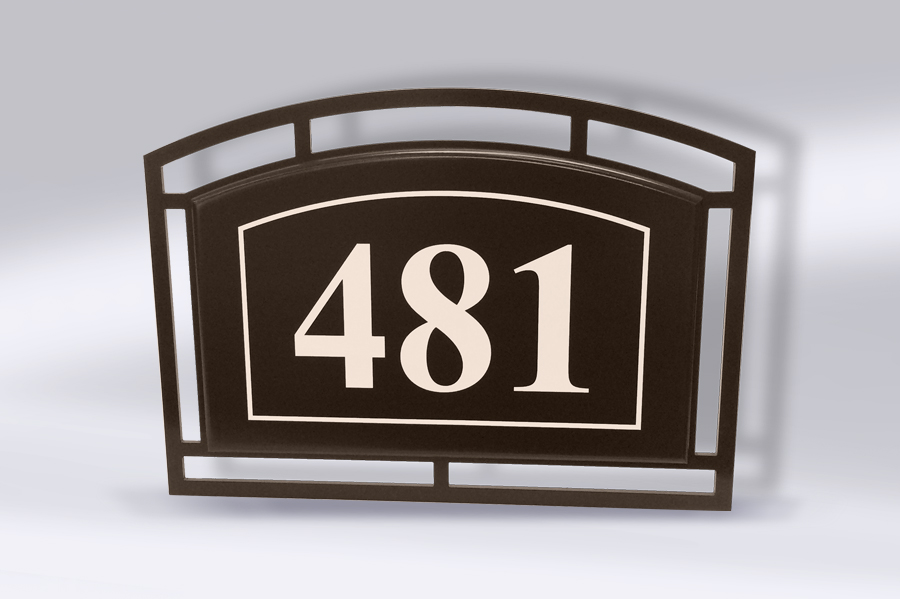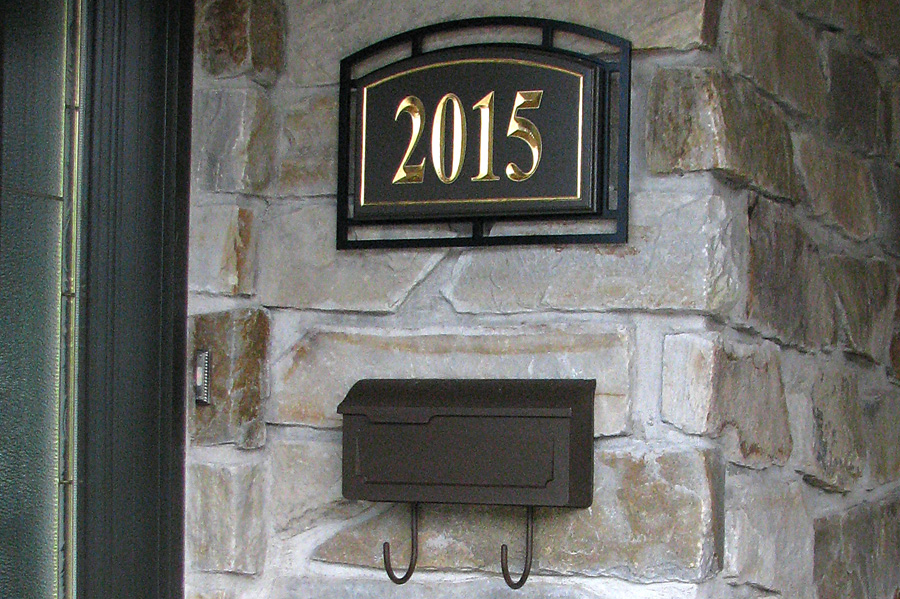 Numéro civique sculpté en composite, peint époxy avec lettrage en vinyle autocollant. Couleurs au choix.